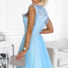 Sukienka tiulowa z koronką błękitna to przeuroczy model, których pokocha każda kobieta. Górę uszyto z wysokiej jakości koronki z wstawkami koronkowymi, które wychodzą delikatnie na ramiona. Talia jest dopasowana, ze złotym paskiem. Natomiast dół sukienki rozkloszowano i pokryto tiulem. Niezwykła sukienka na takie okazje jak komunia, chrzciny czy randka. Poczujesz się w niej nie tylko bardzo kobieco, ale przede wszystkim komfortowo. Sukienka do kolan w najpiękniejszej odsłonie.